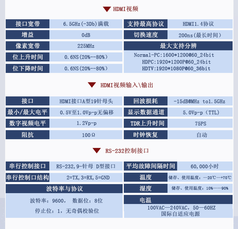 24路系列(24進(jìn)4出;24進(jìn)8出;24進(jìn)16出;24進(jìn)24出;24進(jìn)32出)-HDMI高清全數(shù)字矩陣切換器, 所有端口支持藍(lán)光DVD(支持HDCP);輸入輸出自動(dòng)均衡,輸入加輸出傳輸距離大于40米(不需配帶芯片的HDMI線);鋁拉絲面板,帶藍(lán)光液晶顯示屏顯示操作狀態(tài);帶串口控制,可選配網(wǎng)口;所有輸入端口支持現(xiàn)場(chǎng)寫EDID,所有輸出端口可讀回EDID。