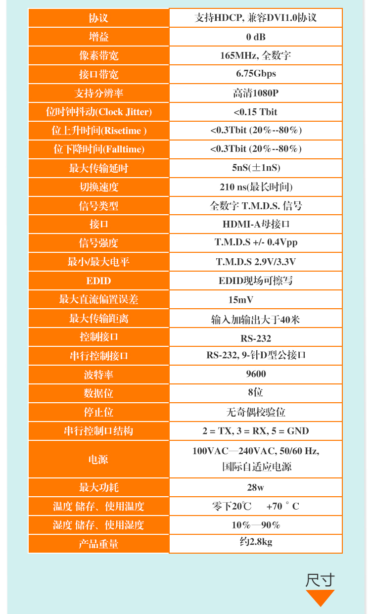-HDMI高清全數(shù)字矩陣切換器, 所有端口支持藍光DVD(支持HDCP);輸入輸出自動均衡,輸入加輸出傳輸距離大于40米(不需配帶芯片的HDMI線);鋁拉絲面板,帶藍光液晶顯示屏顯示操作狀態(tài);帶串口控制,可選配網(wǎng)口;所有輸入端口支持現(xiàn)場寫EDID,所有輸出端口可讀回EDID。